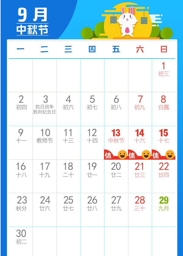 2019年中秋節(jié)9月13日放假,與周末連休。根據(jù)相關(guān)規(guī)定,高速公路免費(fèi)僅針對春節(jié)、清明節(jié)、勞動節(jié)和國慶節(jié)四個(gè)國家法定節(jié)假日,所以,中秋期間高速公路通行不免費(fèi)。
